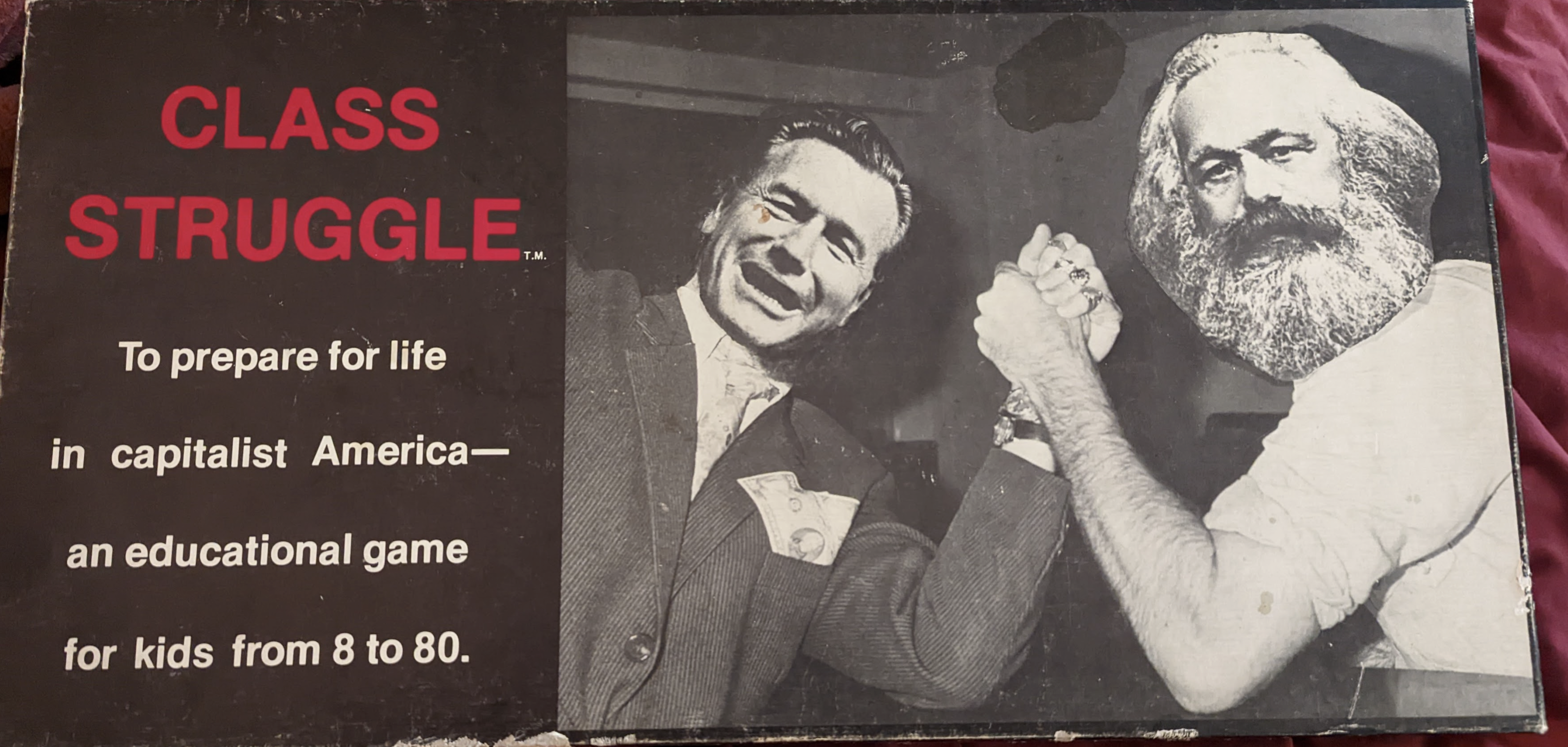 Class Struggle is a board game designed by an NYU professor, Bertell Ollman. There’s like a Wikipedia page about the historical impact of the game and how it taught Marxism through gameplay. It discusses how people called it subversive and tried to get rid of it, Mentalfloss talks more about the relationship to Monopoly (originally called The Landlord’s Game, which was to be about georgism and not capitalism before Hasbro got to it). I’ve also digitized the contents of the game at the bottom!