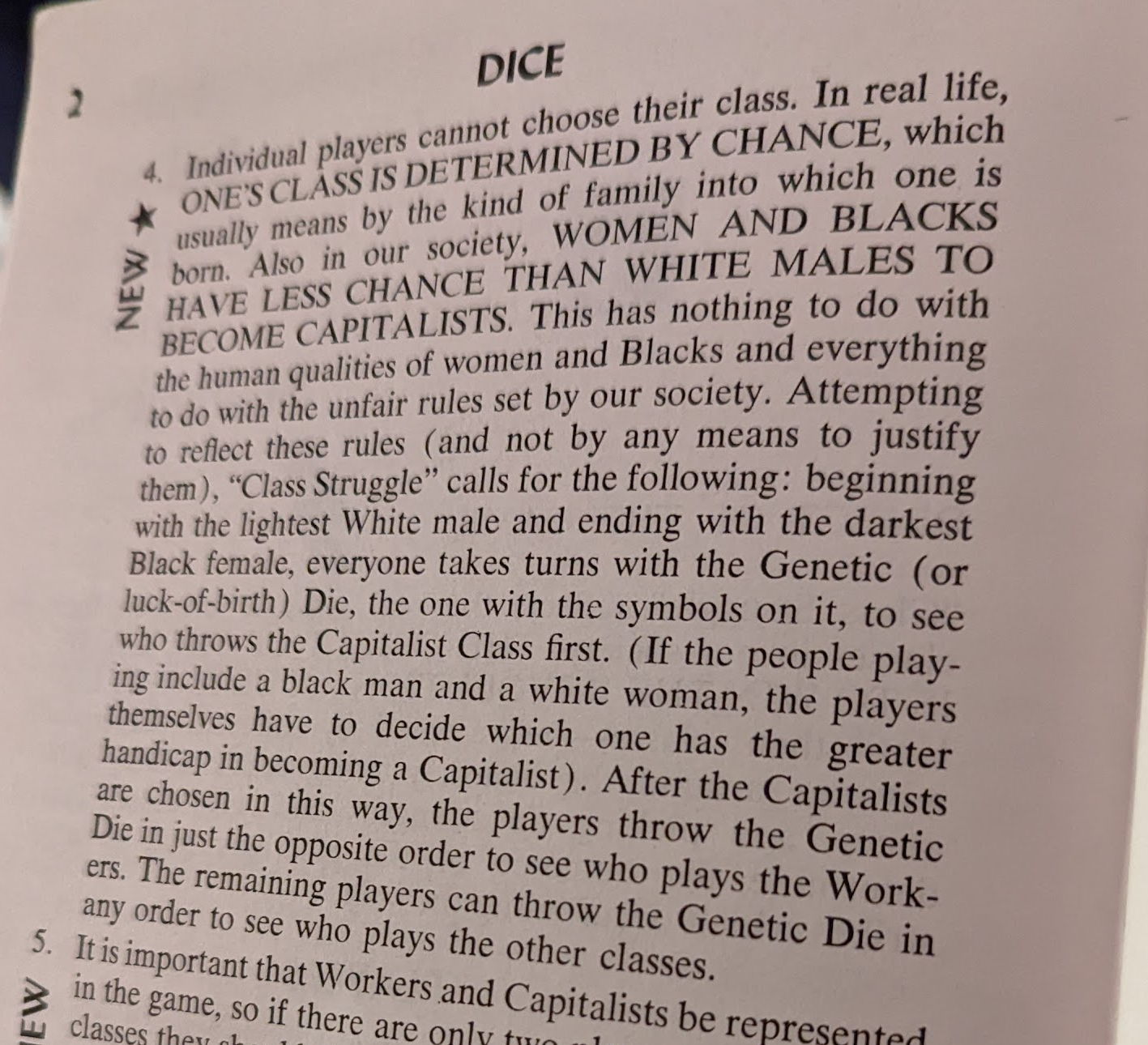 Individual players cannot choose their class. In real life, ONE'S CLASS IS DETERMINED BY CHANCE, which usually means by the kind of family into which one is born. Also in our society, WOMEN AND BLACKS HAVE LESS CHANCE THAN WHITE MALES TO BECOME CAPITALISTS. This has nothing to do with the human qualities of women and Blacks and everything to do with the unfair rules set by our society. Attempting to reflect these rules (and not by any means to justify them), "Class Struggle" calls for the following: beginning with the lightest White male and ending with the darkest Black female, everyone takes turns with the Genetic (or luck-of-birth) Die, the one with the symbols on it, to see who throws the Capitalist Class first. (If the people playing include a black man and a white woman, the players themselves have to decide which one has the greater handicap in becoming a Capitalist). After the Capitalists are chosen in this way, the players throw the Genetic Die in just the opposite order to see who plays the Workers. The remaining players can throw the Genetic Die in any order to see who plays the other classes.