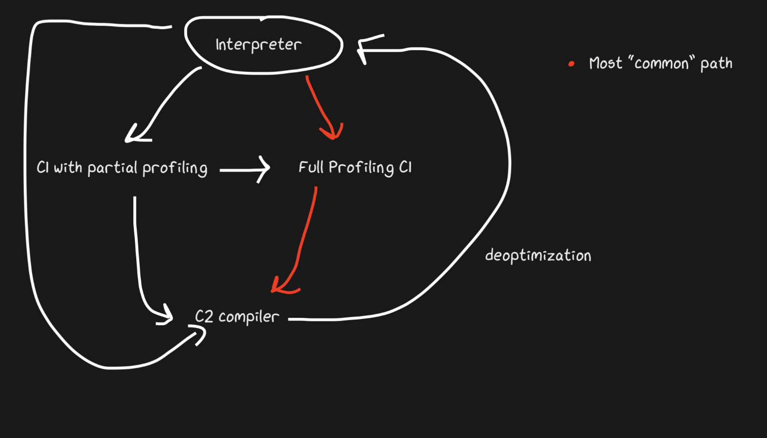 Hotspot is a tiering JIT, with two compilers; C1 and C2. The C1 compiler will kick in first and do a quick compile and run then run full profiling to get C2 compiled code. This can help clear up a lot of our concerns with warmup. Unoptimized compiled code is still faster than interpreting and aquiring that unoptimized compiled code is faster. Another fancy thing is that not all code will be compiled by C1 and C2. If a function is deemed trivial enough, it's very likely that optimized C2 output will not be helpful and no attempt will be made (and profiling time is saved!). If perhaps C1 is busy compiling, then the profiling can continue and skip C1 to be compiled by C2 directly.