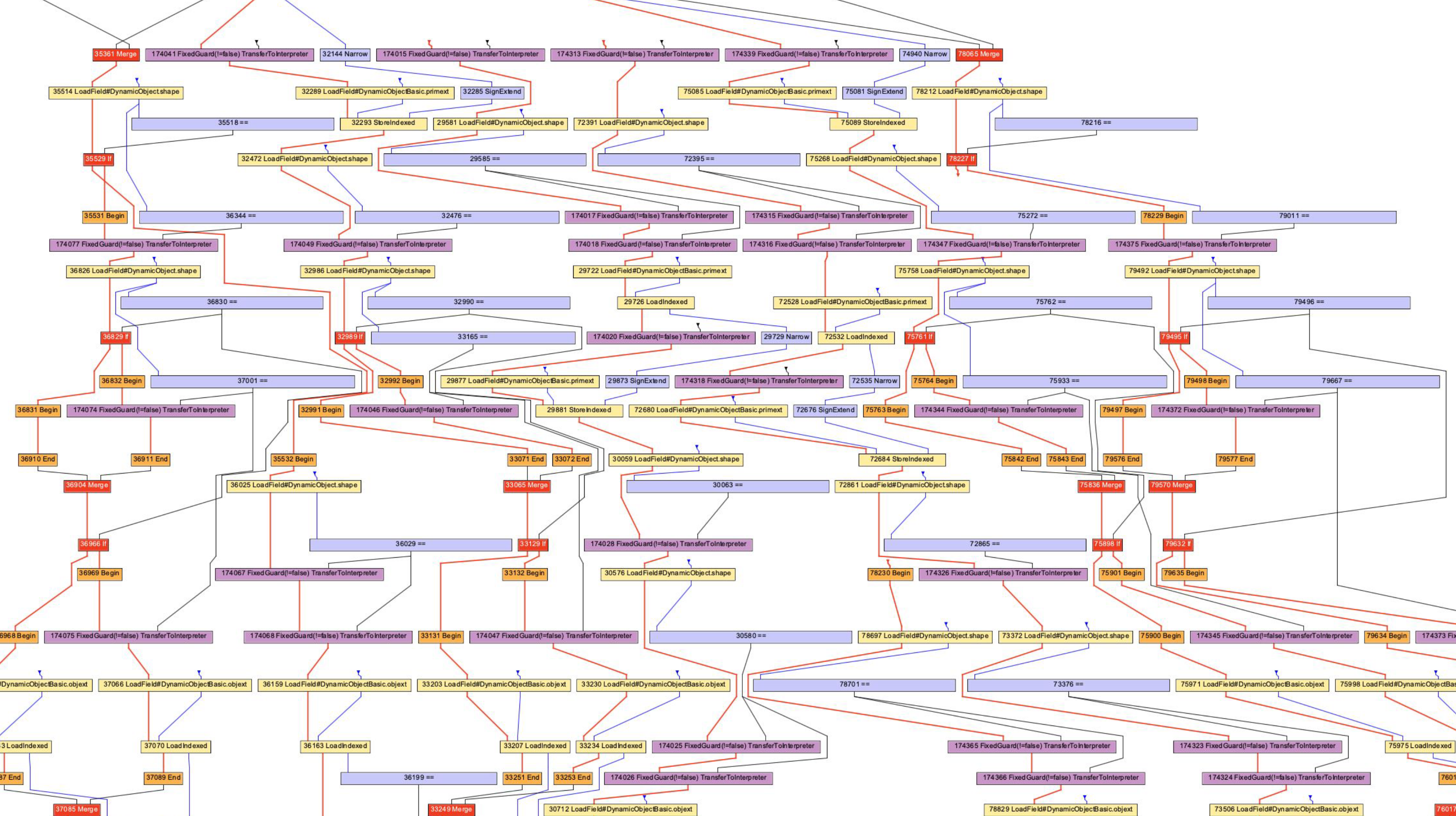 This of course, looks much simpler. Red is control flow, blue is water data flow, and arrows are directions. Note that the fact that this graph appears simpler than the AST from V8, does not indicate that Graal has better simplified the program. Rather, this graph is generated from Java which is much less dynamic. The same Graal graph generated from Ruby would closer resemble that first photo of the graph.